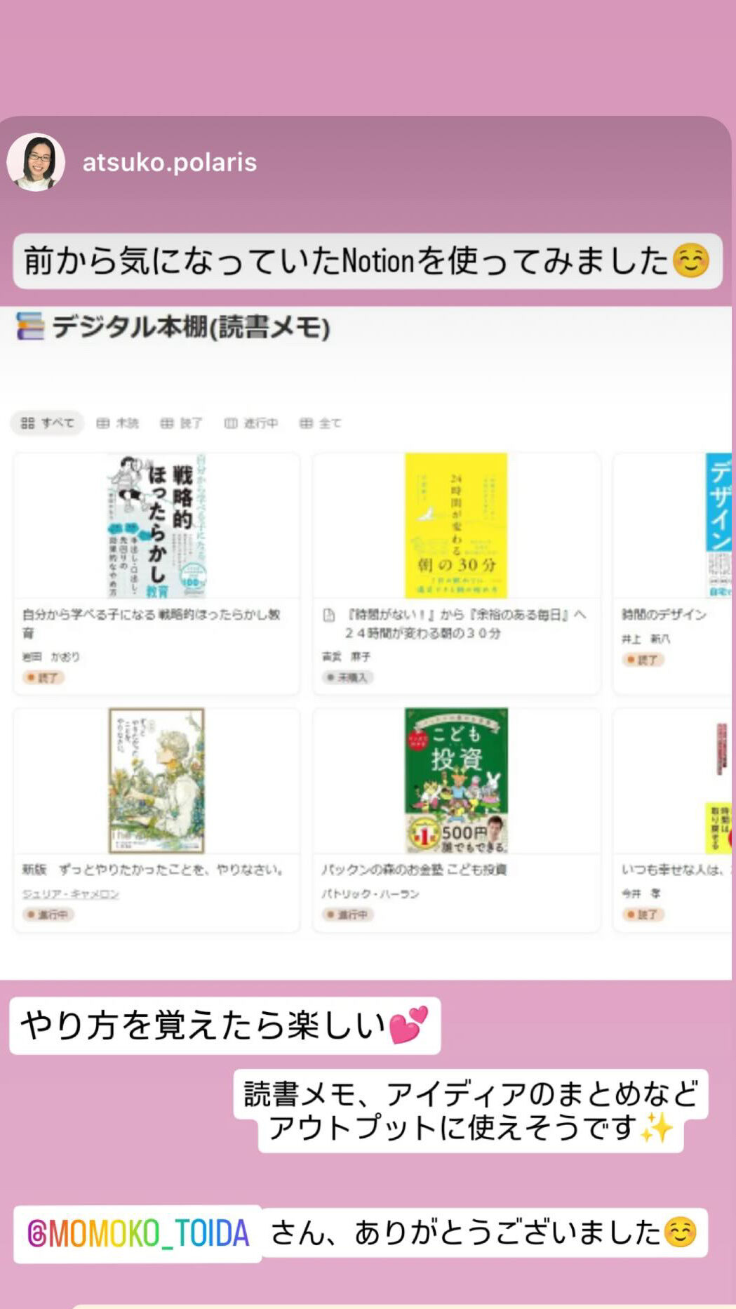 • 「読書ノートを作りたいと思いながら、いつも途中で終わっていました。Notionなら検索もできて、スクショも貼れて、すごく便利!読んで終わりじゃなく、学びを見返せるのがうれしいです♪」