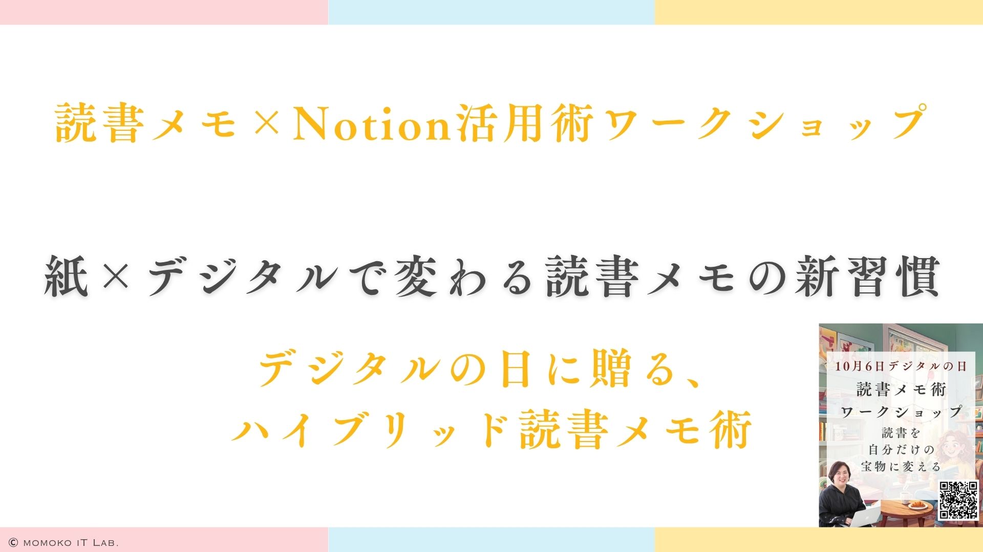 Momoko iT Labは、2025年10月6日「デジタルの日」に、ノートアプリNotionを使った読書メモ術のオンラインワークショップを開催し、22名が参加。紙の温かさとデジタルの便利さを融合した新しい読書習慣を提案しました。