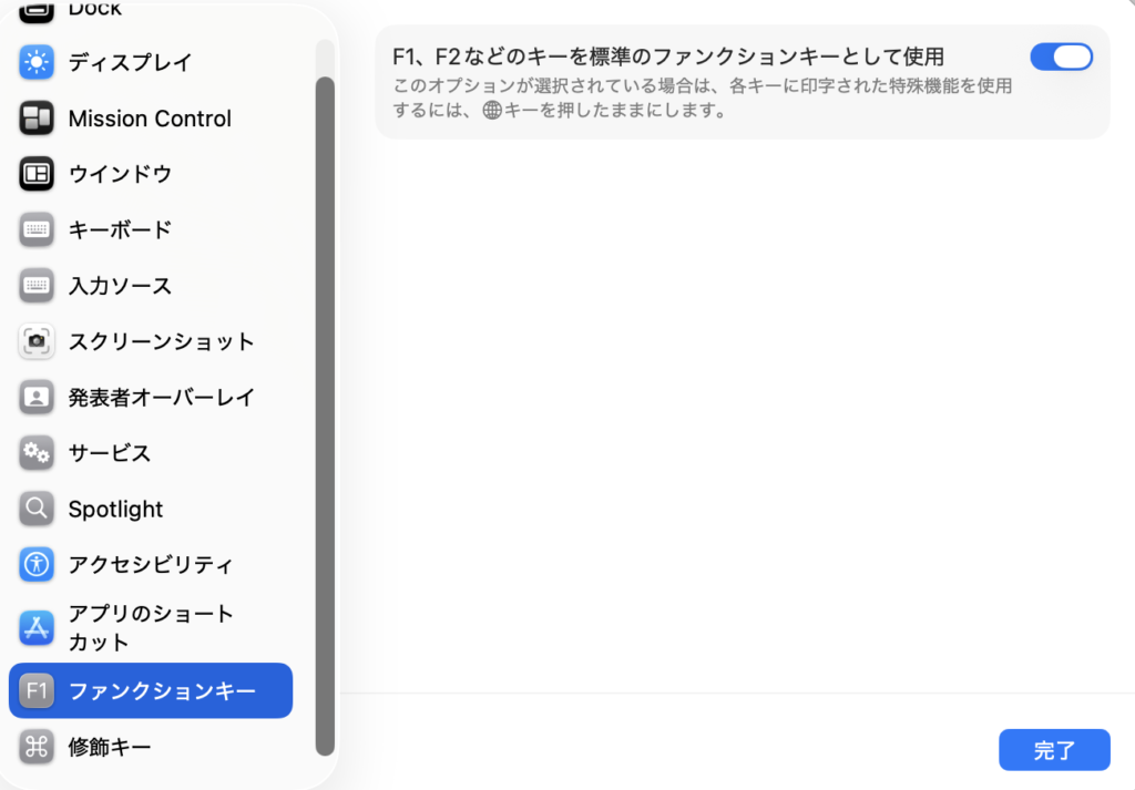 - 「F1、F2などのキーを標準のファンクションキーとして使用」